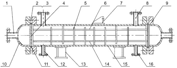 9、设备法兰 10、封头 11、垫片 12、排液口 13、支座 14、拉杆 15、筒体 16 壳程接管 |
