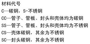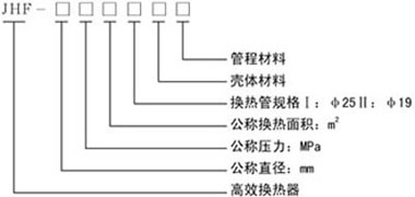 | 如公称直径为400,公称压力为1.0M P a,换热面积为9m2,换热管规格为φ19,材质:壳体为碳钢,其余为不锈钢的高效换热器,其型号表示为:JHF400-1.0-9II-CS |