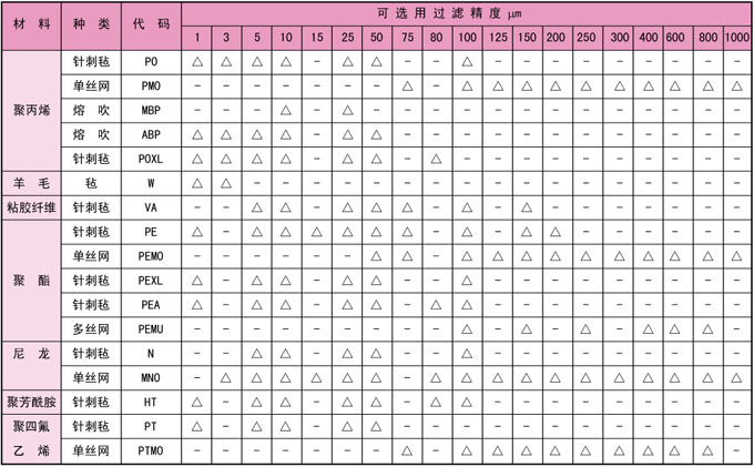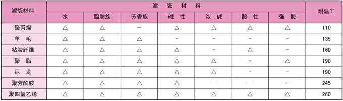 | 滤袋是袋式精细过滤器的核心件。我公司提供的高品质滤袋是您完美、一致性过滤的保证。构成滤袋的纤维材料有聚丙烯、聚酯、聚四氟乙烯、聚芳酰胺、尼龙、羊毛等,过滤精度1-1000μm,选用时应根据不同介质,抗化学性能及耐温来确定。详见下表: |